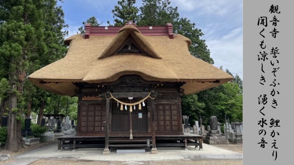 The temple was located above a waterfall with a strong current which prevented the koi from continuing their swim upstream. The koi were forced to turn back, which with led to the naming of Koigaeri Kannon. Another narrative posits the koi turned back in fear from the power emanating from the Kannzeon.